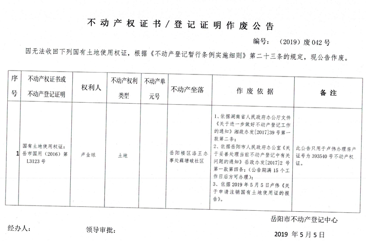 不动产权证书、登记证明作废公告 编号: (2019)废042号(卢金球)
