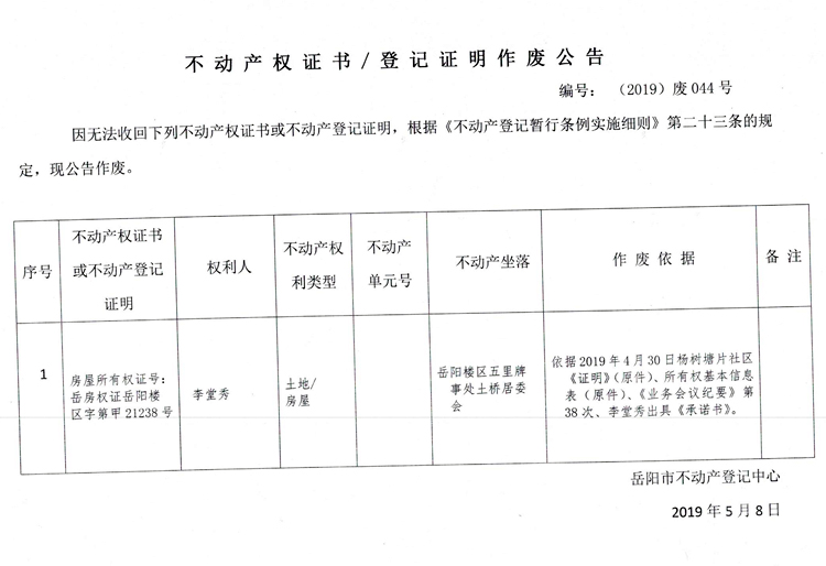 不动产权证书、登记证明作废公告 编号: (2019)废044号(李堂秀)