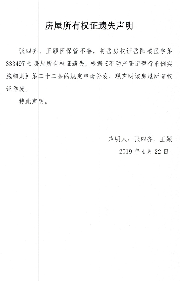 房屋所有权证遗失声明( 张四齐、王颖)