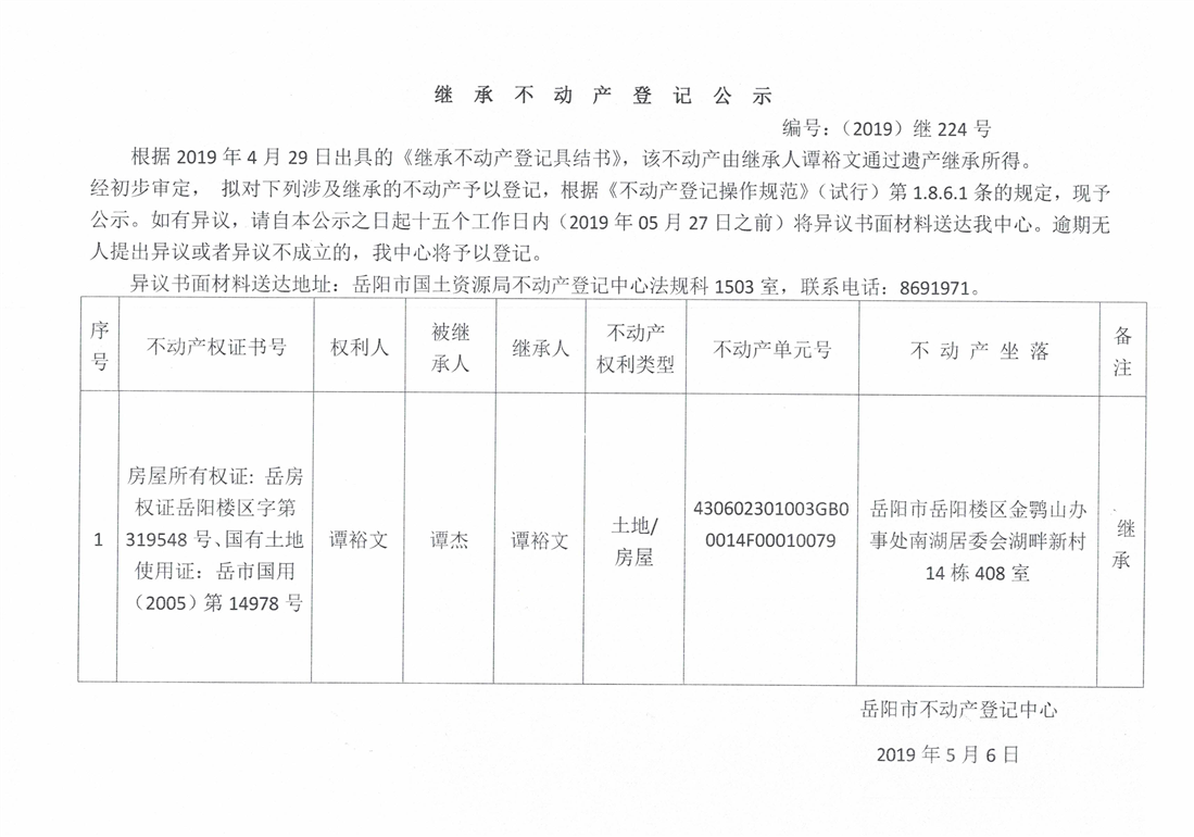 继承不动产登记公示 编号:(2019)继号224号