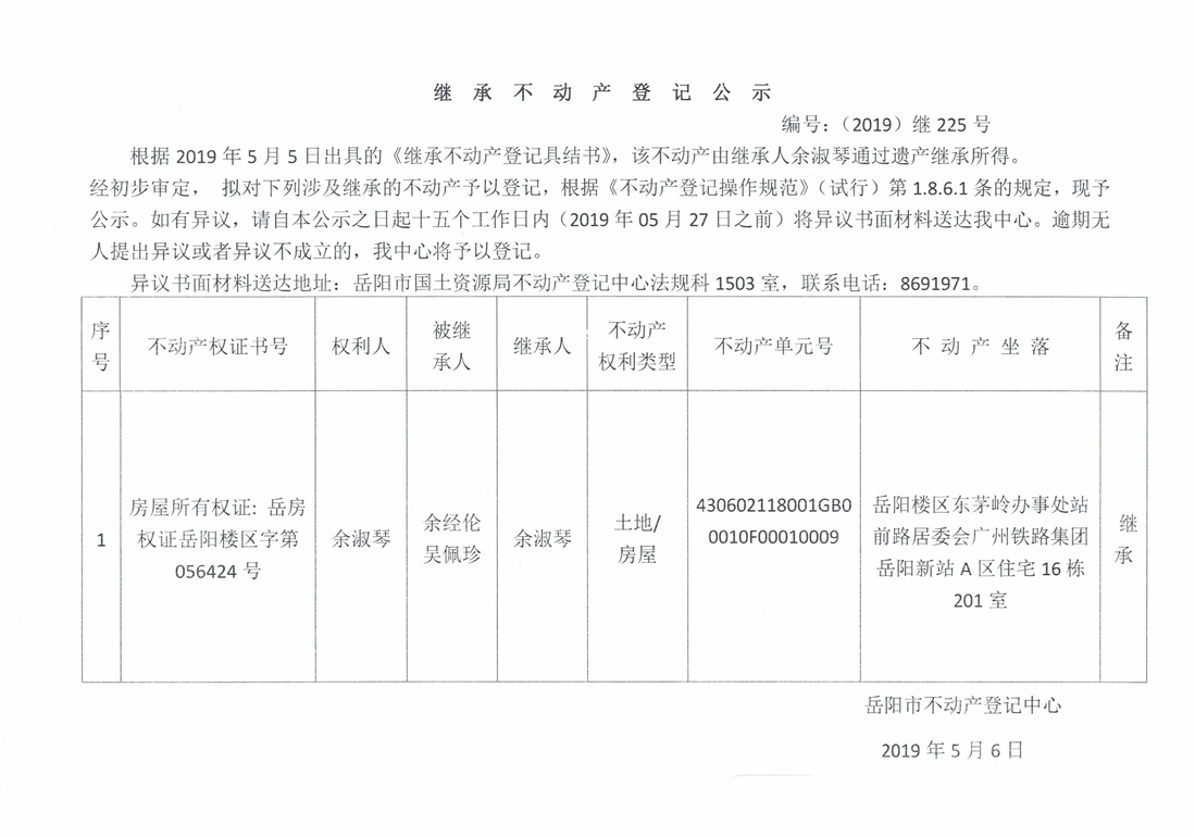 继承不动产登记公示 编号:(2019)继号225号