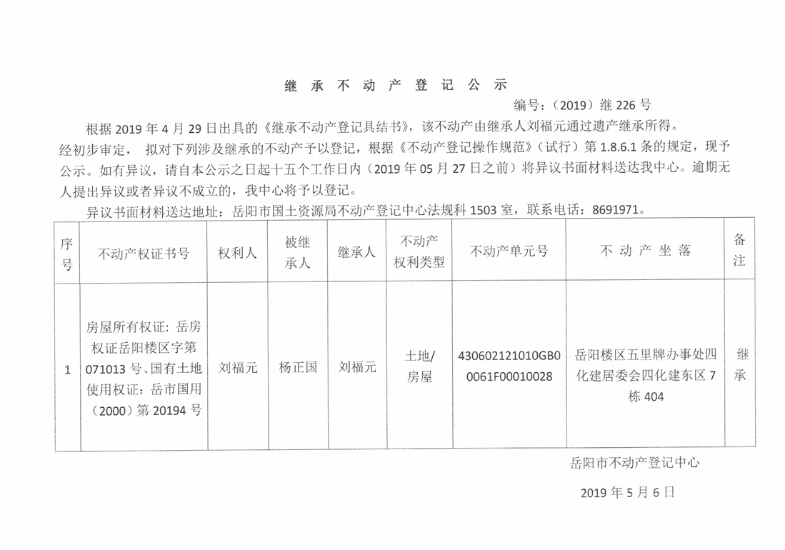 继承不动产登记公示 编号:(2019)继号226号