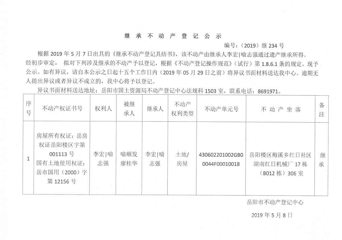 继承不动产登记公示 编号:(2019)继号234号
