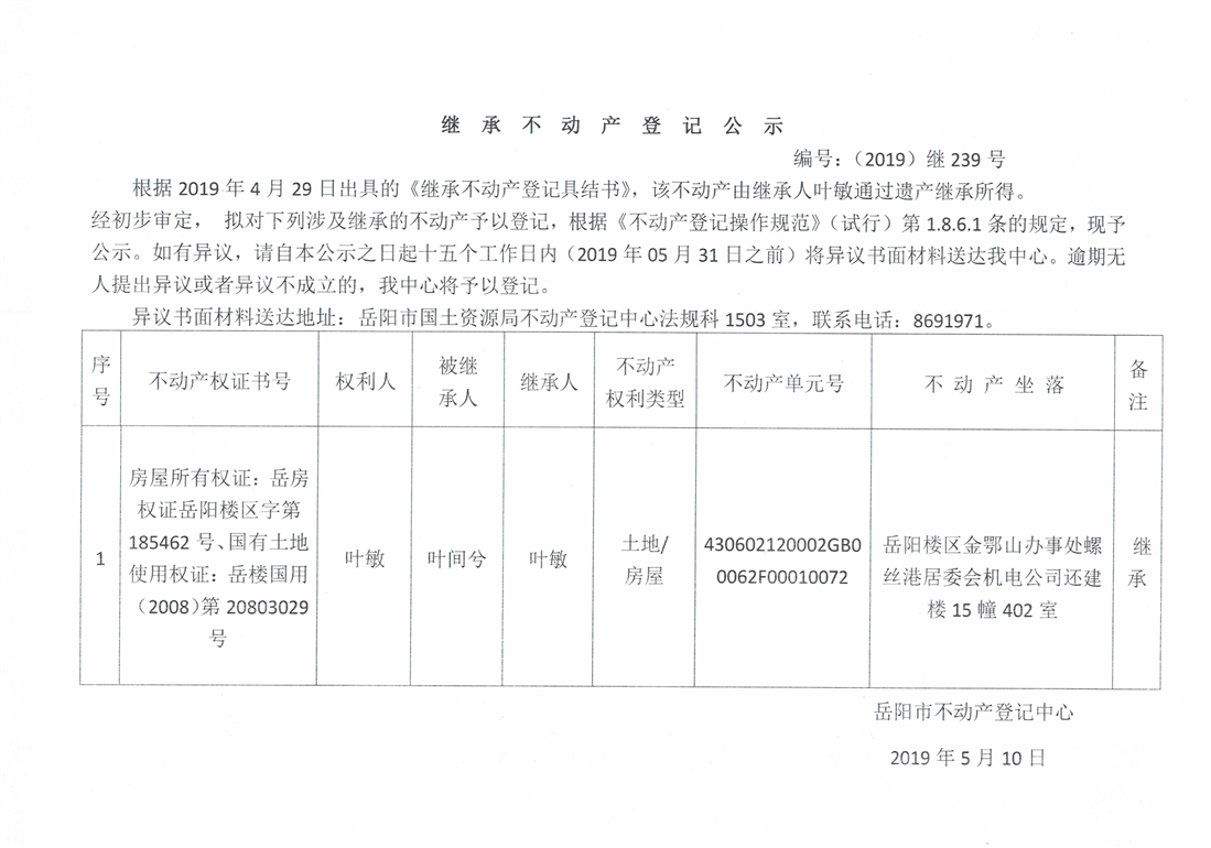 继承不动产登记公示 编号:(2019)继号239号