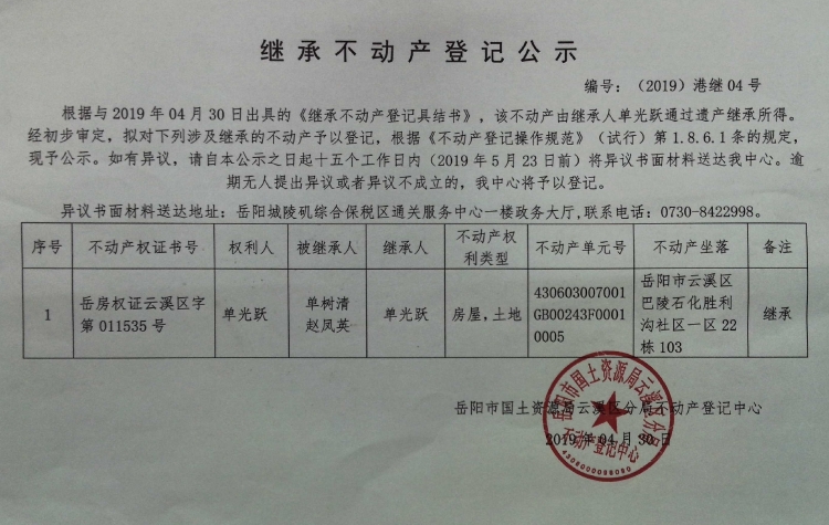 继承不动产登记公示 编号:(2019) 港继04号