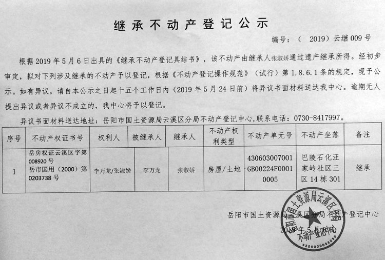 继承不动产登记公示 编号(2019)云继009号
