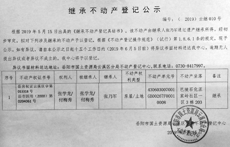 继承不动产登记公示 编号(2019)云继010号