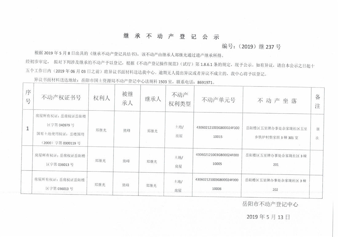 继承不动产登记公示 编号:(2019)继号237号(郑继光)