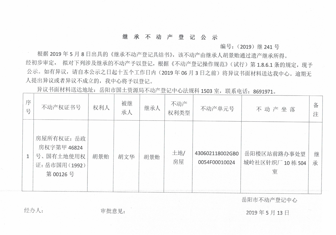继承不动产登记公示 编号:(2019)继号241号(胡景贻)