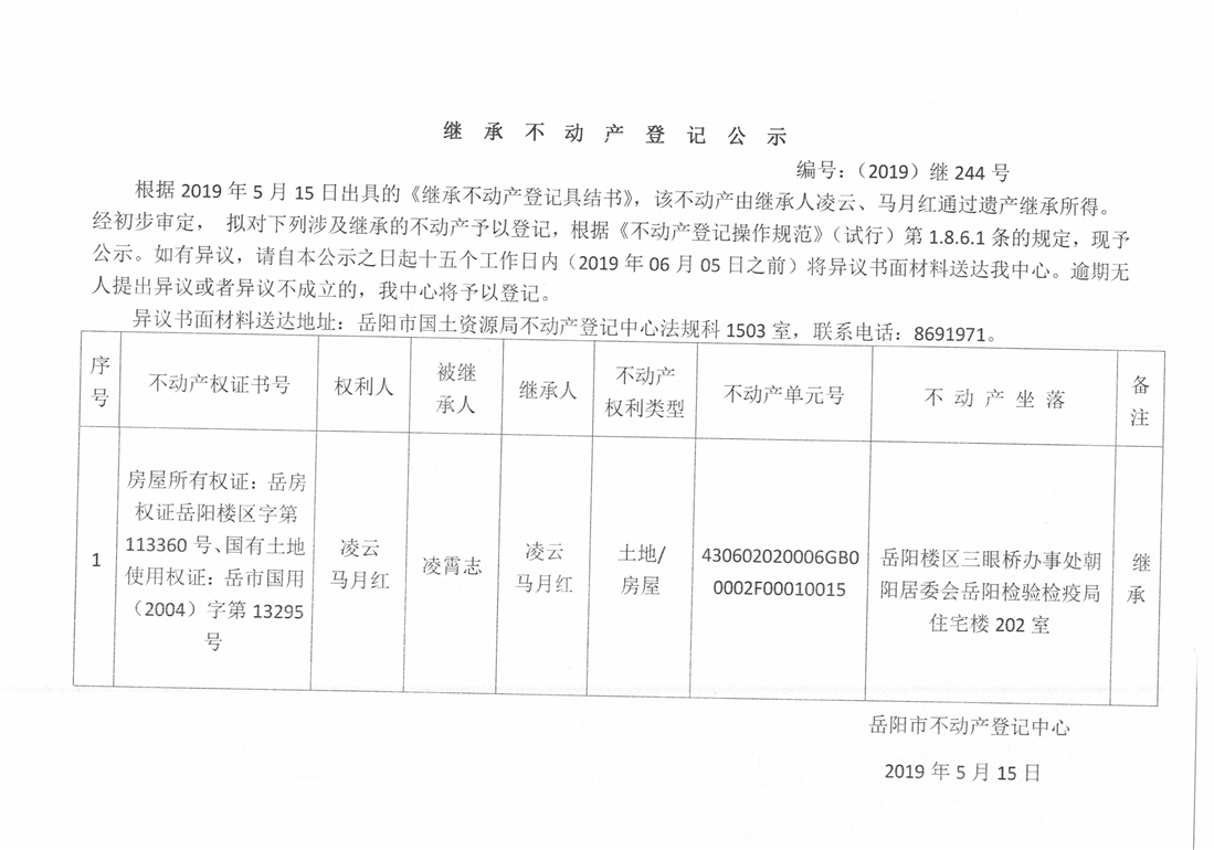 继承不动产登记公示 编号:(2019)继号244号(凌云)