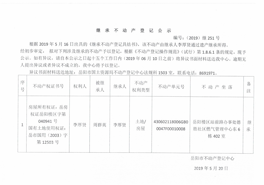 继承不动产登记公示 编号:(2019)继号251号(李厚贤)