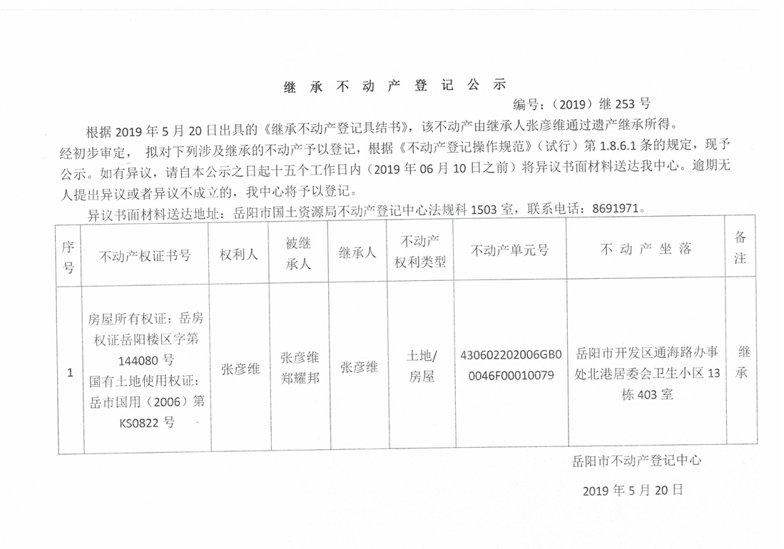 继承不动产登记公示 编号:(2019)继号253号(张彦维)