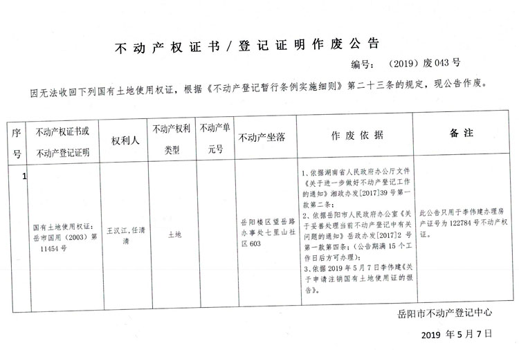 不动产权证书、登记证明作废公告 编号:(2019)废043号(王汉江、任清清)