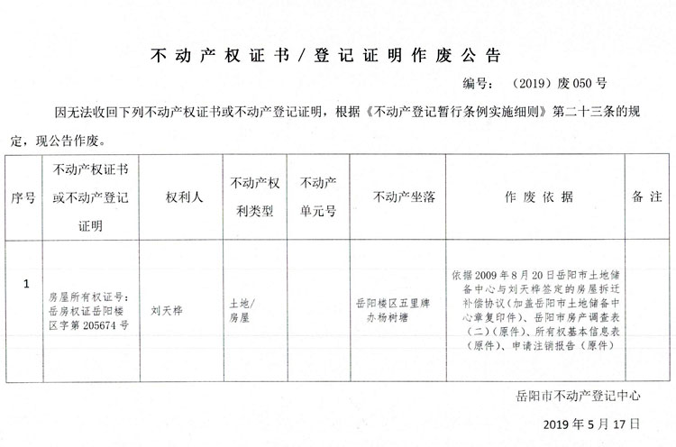 不动产权证书、登记证明作废公告 编号: (2019)废050号(刘天桦)