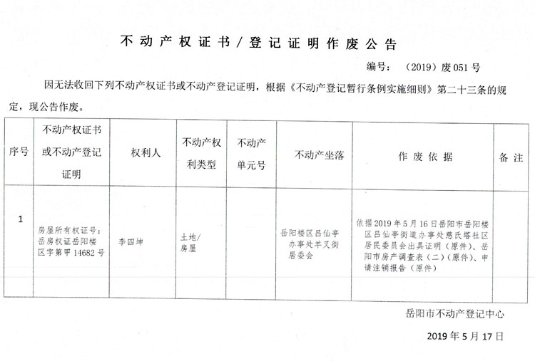 不动产权证书、登记证明作废公告 编号: (2019)废051号(李四坤)