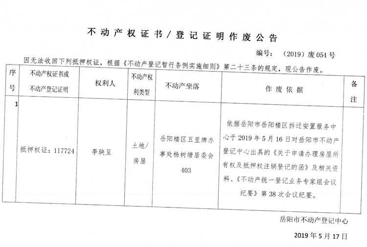 不动产权证书、登记证明作废公告 编号: (2019)废054号(李玦呈)