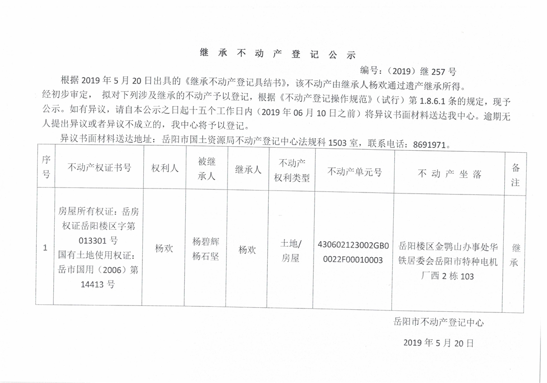 继承不动产登记公示 编号:(2019)继号257号(杨欢)