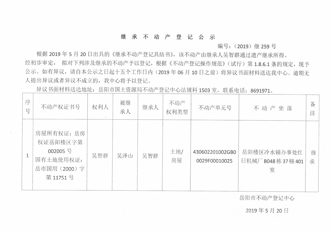 继承不动产登记公示 编号:(2019)继号259号(吴智群)