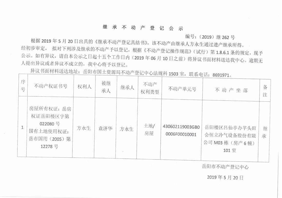 继承不动产登记公示 编号:(2019)继号262号(方永生)