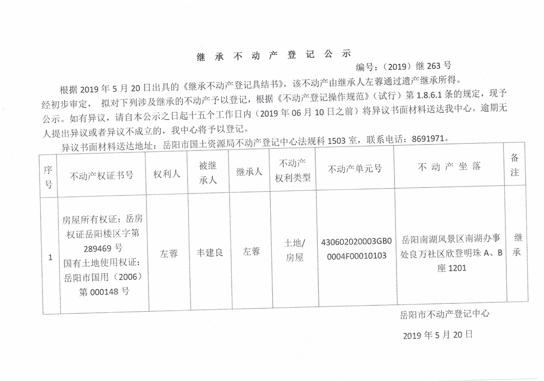 继承不动产登记公示 编号:(2019)继号263号(左蓉)