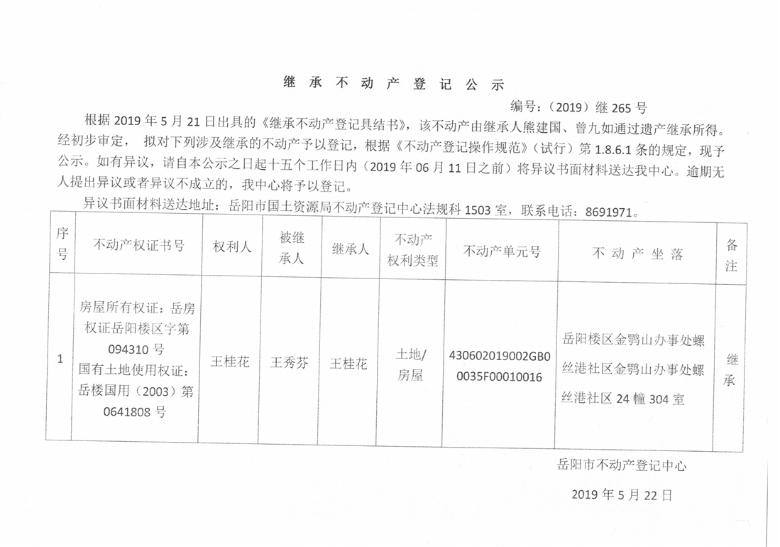 继承不动产登记公示 编号:(2019)继号265号(王桂花)
