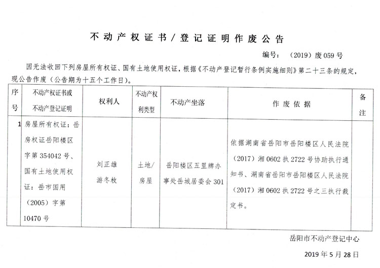 不动产权证书、登记证明作废公告 编号: (2019)废059号(刘正雄、游冬枚)