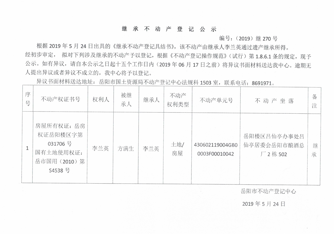 继承不动产登记公示 编号:(2019)继号270号(李兰英)