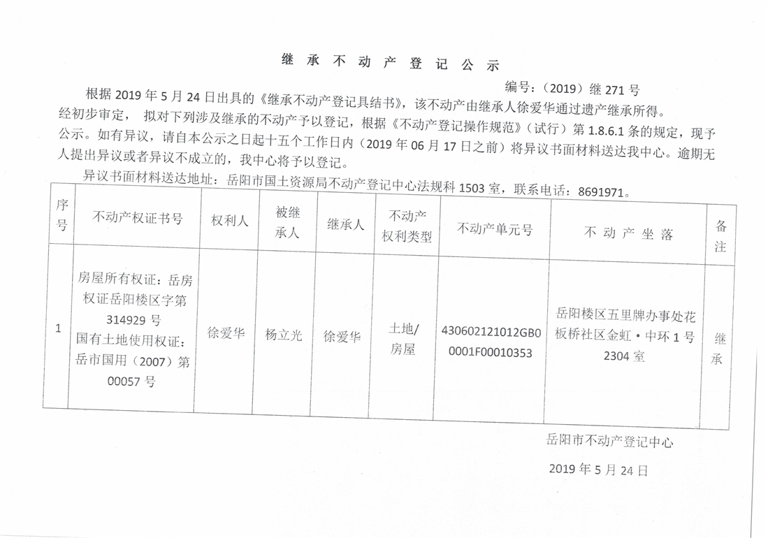 继承不动产登记公示 编号:(2019)继号271号(徐爱华)