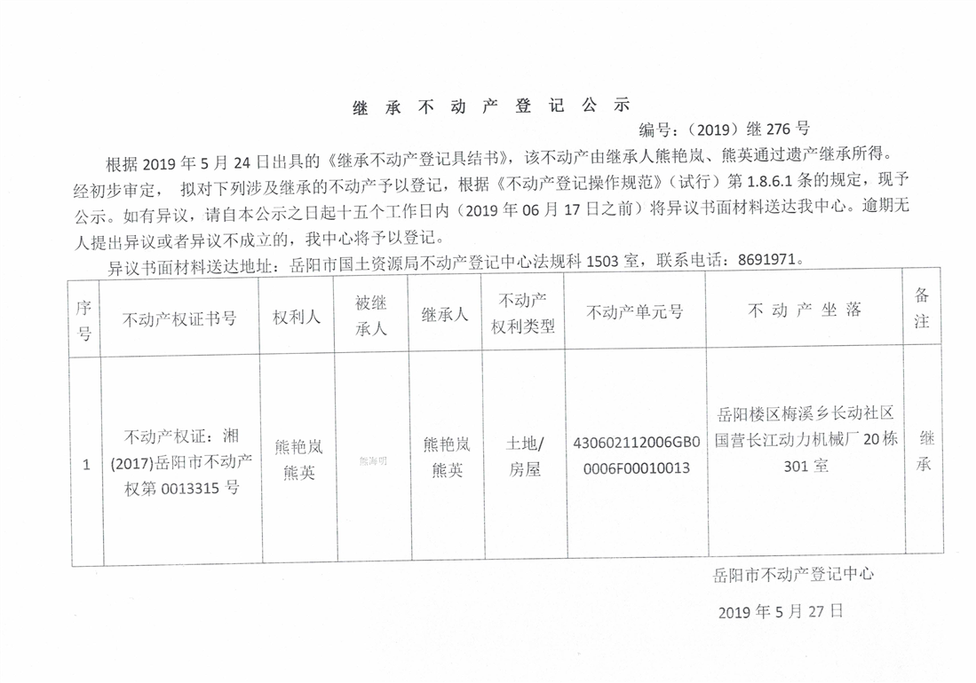 继承不动产登记公示 编号:(2019)继号276号(熊英)
