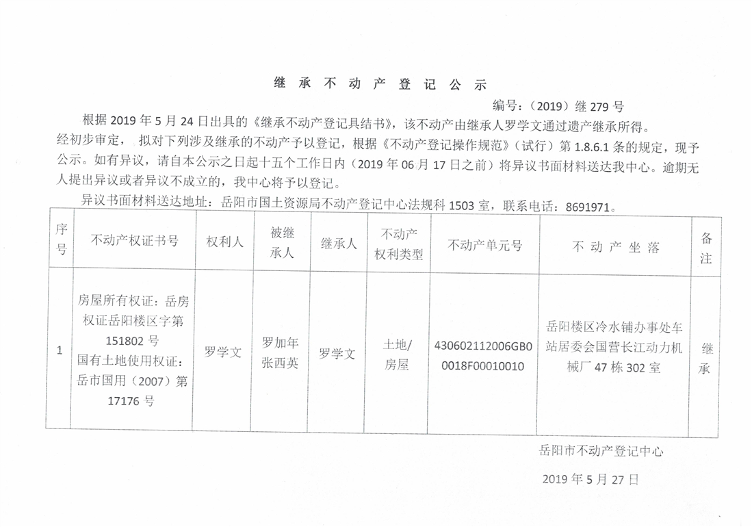 继承不动产登记公示 编号:(2019)继号279号(罗学文)