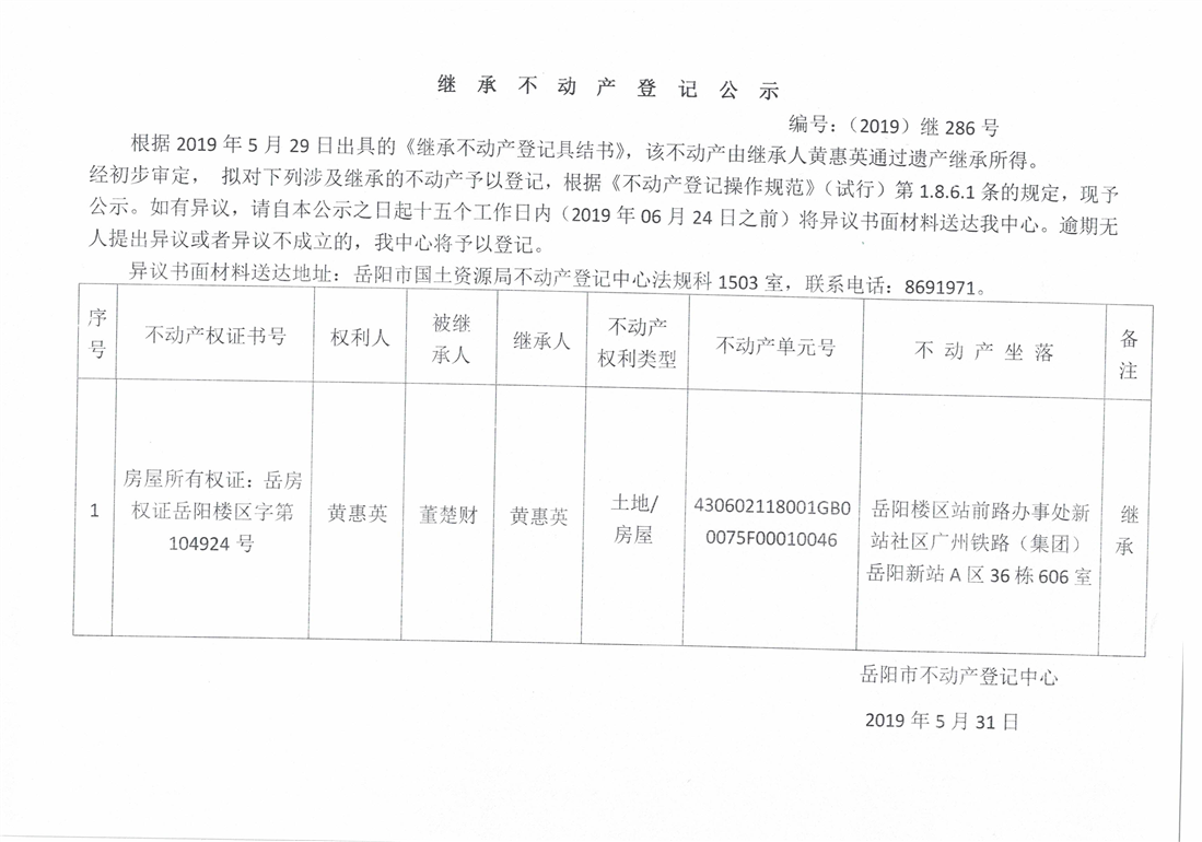 继承不动产登记公示 编号:(2019)继号286号(黄惠英)