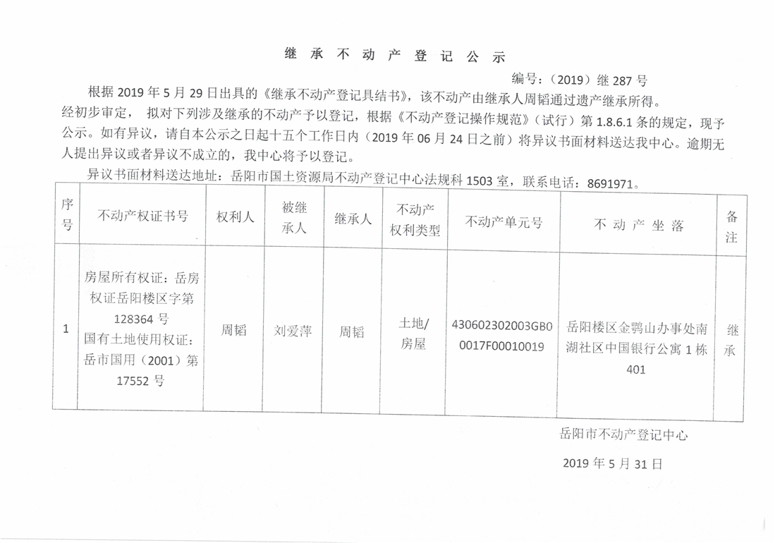 继承不动产登记公示 编号:(2019)继号287号(周韬)
