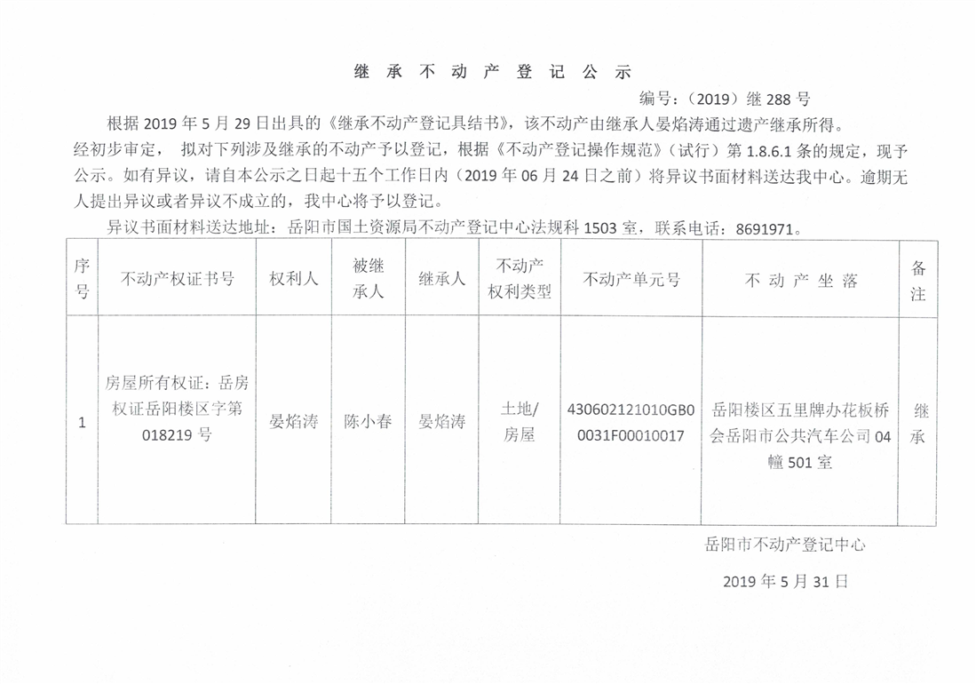 继承不动产登记公示 编号:(2019)继号288号(晏焰涛)