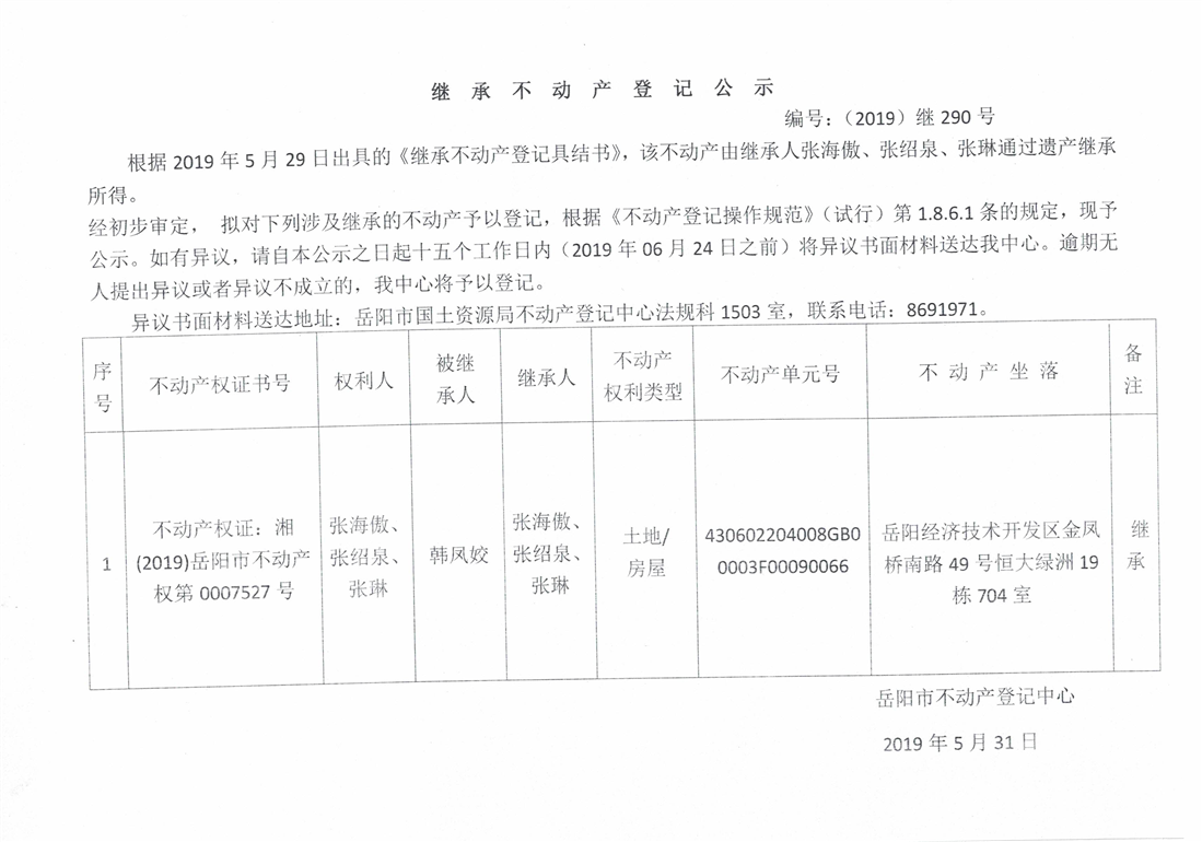 继承不动产登记公示 编号:(2019)继号290号(张海傲)