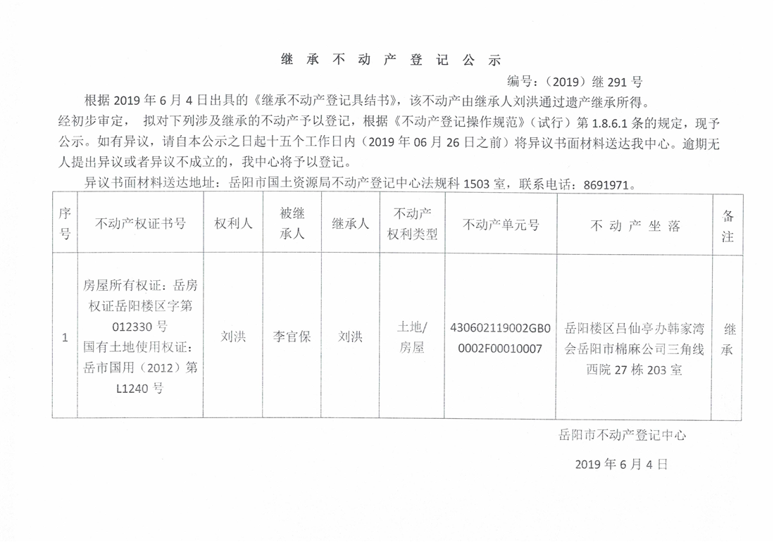 继承不动产登记公示 编号:(2019)继号291号(刘洪)