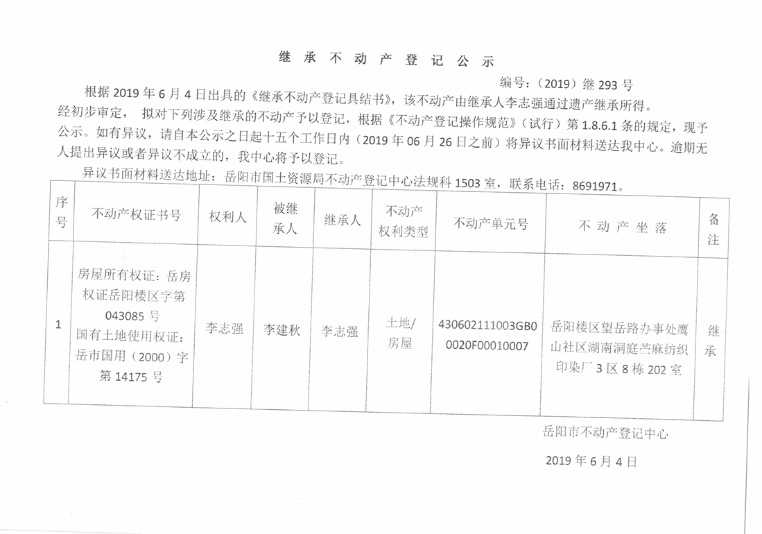 继承不动产登记公示 编号:(2019)继号293号(李志强)