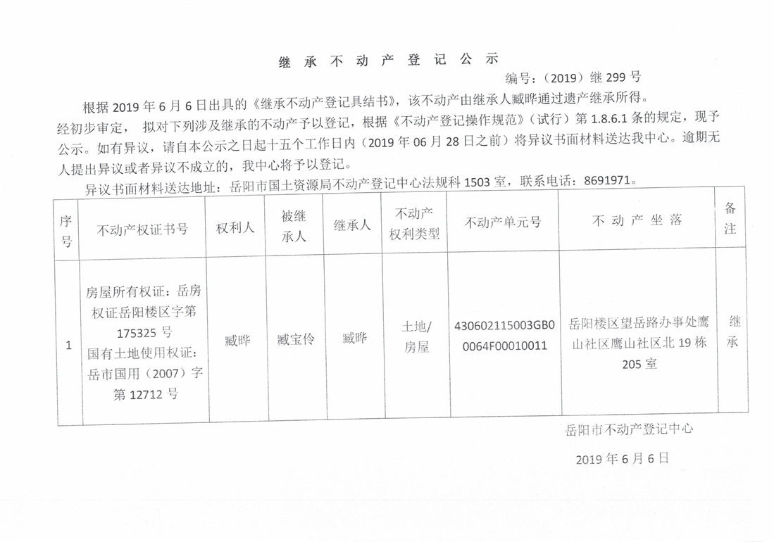 继承不动产登记公示 编号:(2019)继299号(臧晔)