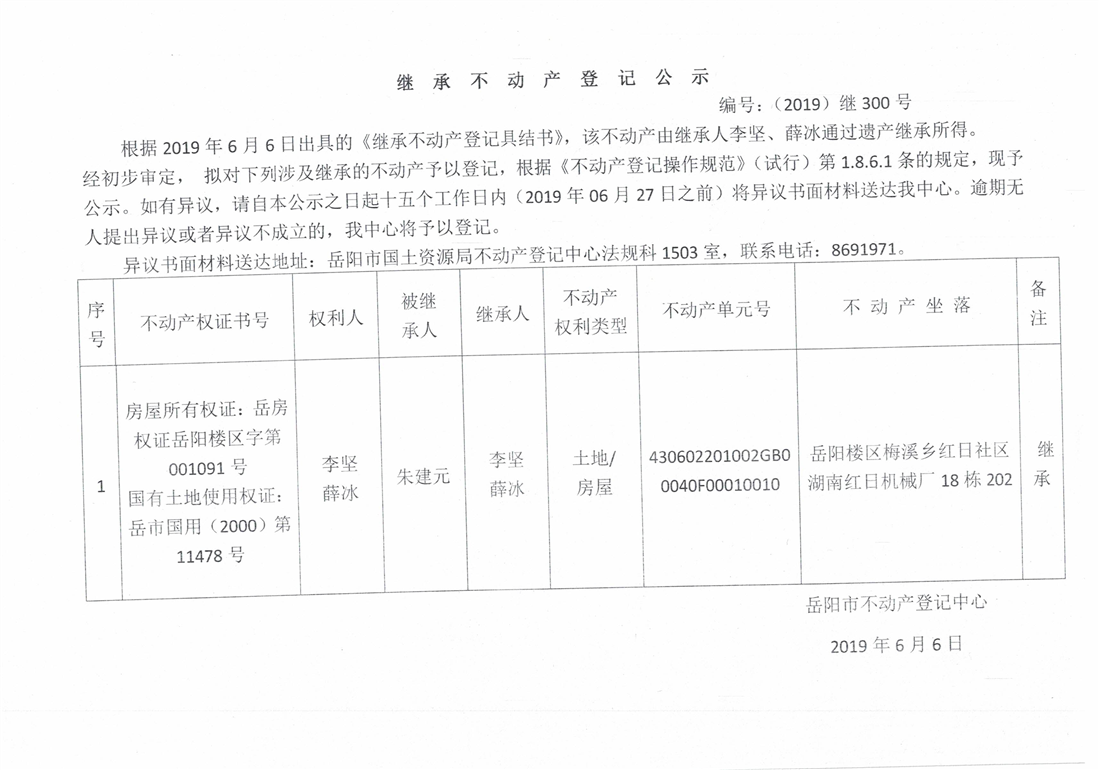 继承不动产登记公示 编号:(2019)继300号(李坚)
