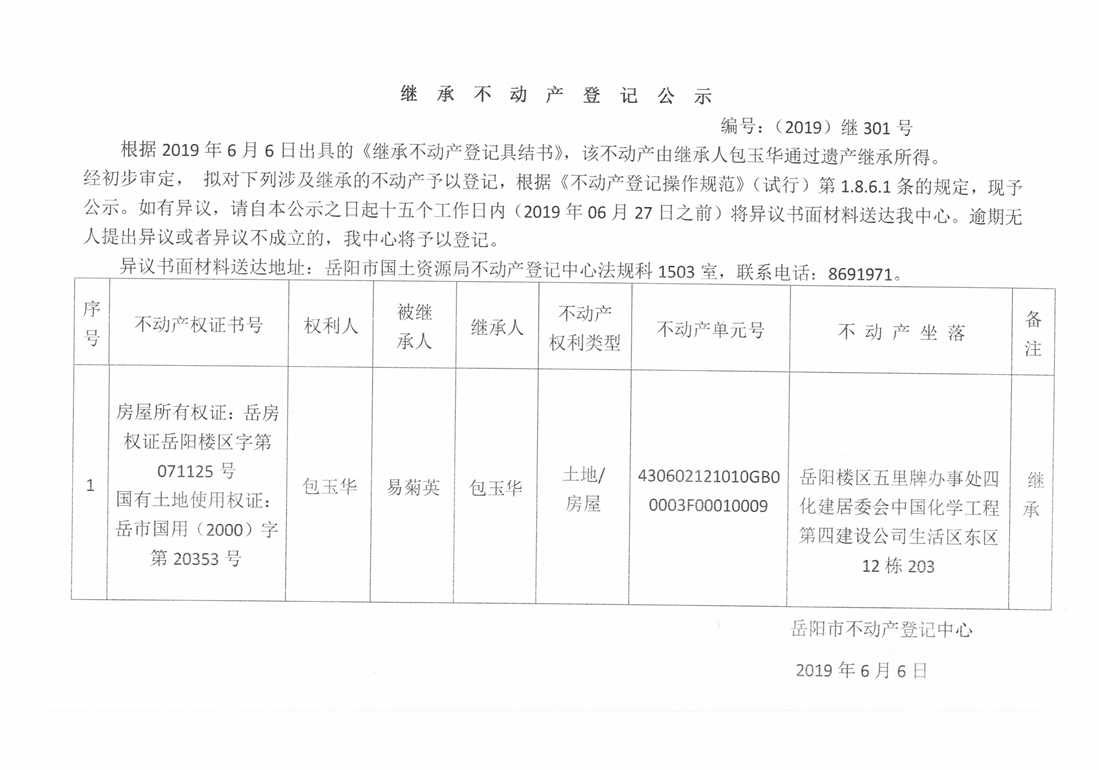 继承不动产登记公示 编号:(2019)继301号(包玉华)