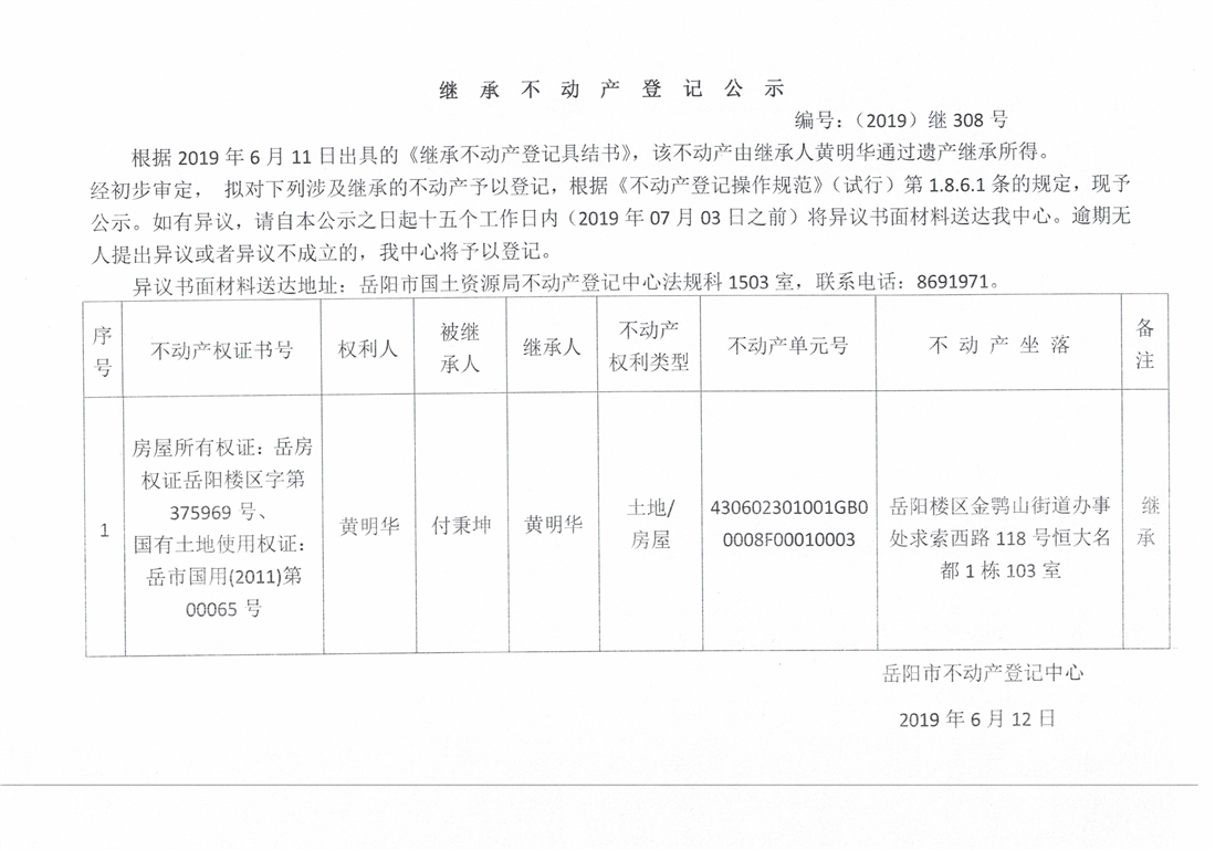 继承不动产登记公示 编号:(2019)继308号(黄明华)