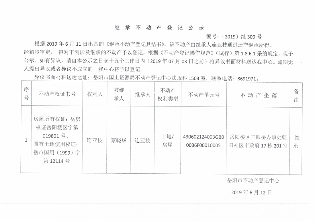 继承不动产登记公示 编号:(2019)继309号(连亚枝)