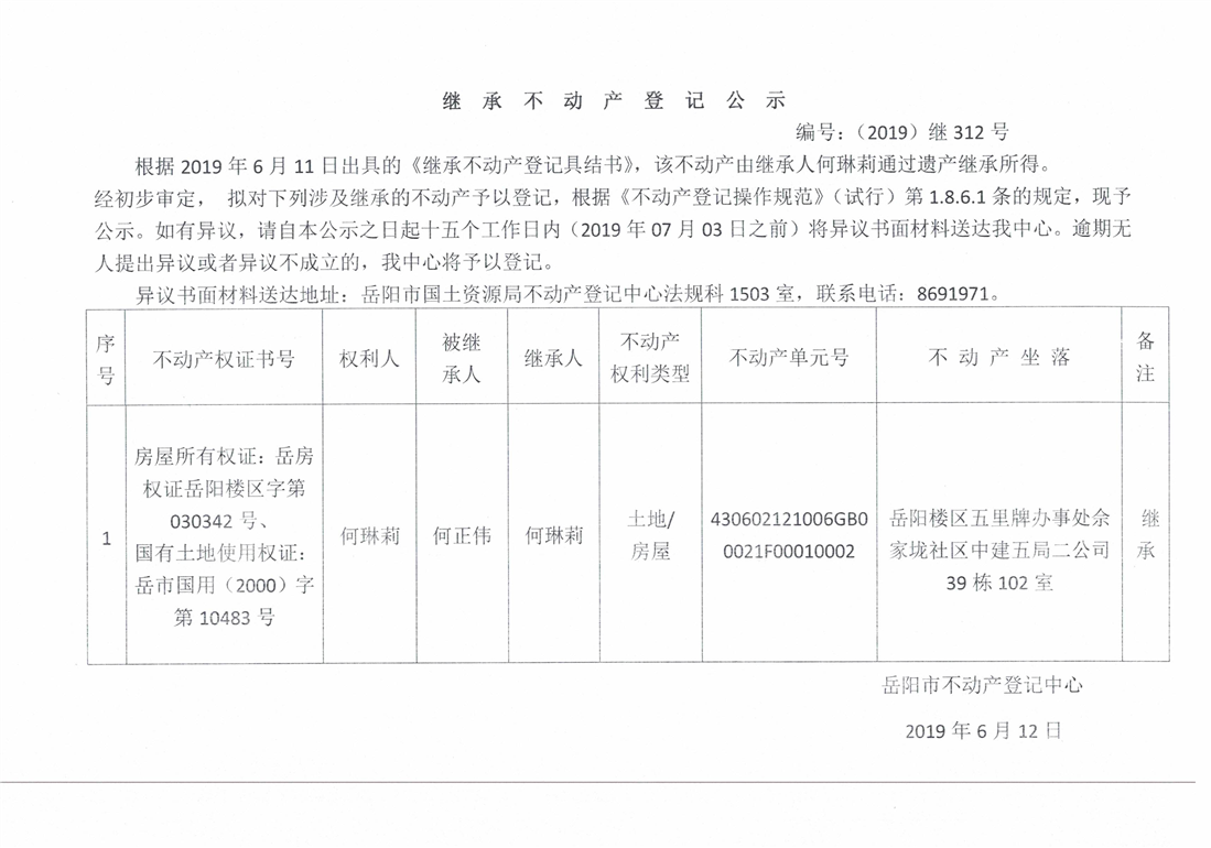 继承不动产登记公示 编号:(2019)继312号(何琳莉)