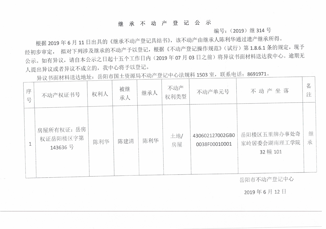 继承不动产登记公示 编号:(2019)继314号(陈利华)