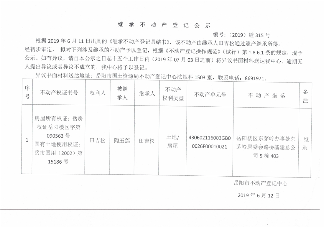 继承不动产登记公示 编号:(2019)继315号(田吉松)