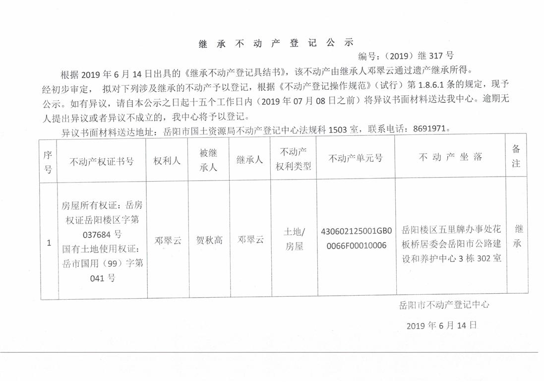 继承不动产登记公示 编号:(2019)继317号(邓翠云)