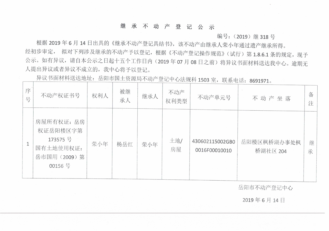 继承不动产登记公示 编号:(2019)继318号(荣小年)