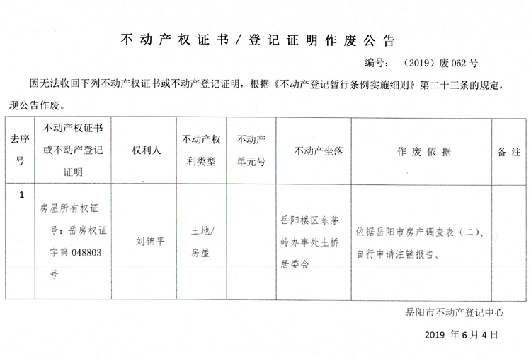 不动产权证书、登记证明作废公告 编号: (2019)废062号(刘锦平)