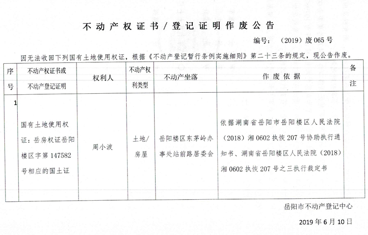 不动产权证书、登记证明作废公告 编号: (2019)废065号(周小波)