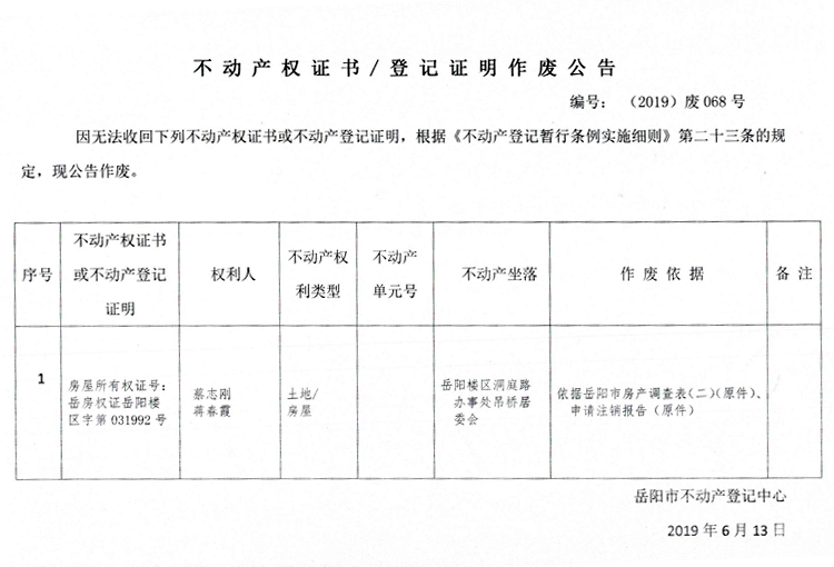 不动产权证书、登记证明作废公告 编号: (2019)废068号(蔡志刚、蒋春霞)