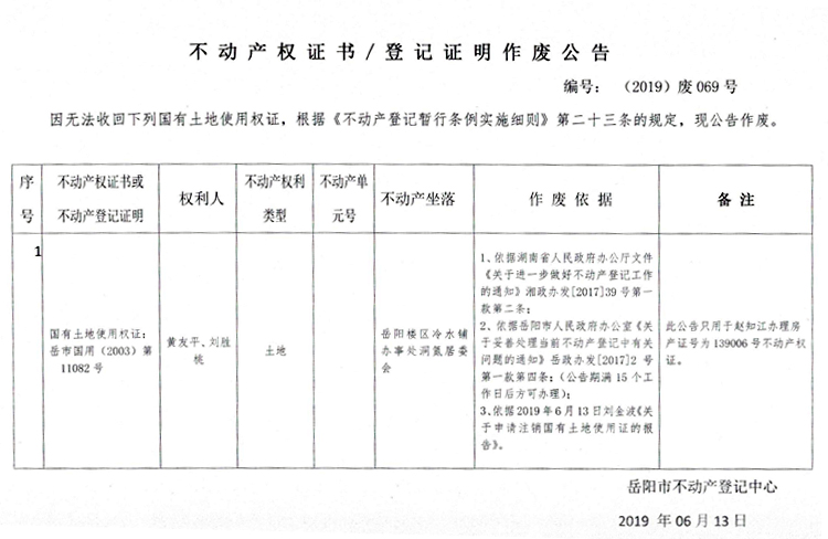不动产权证书、登记证明作废公告 编号: (2019)废069号(黄友平、刘胜桃)